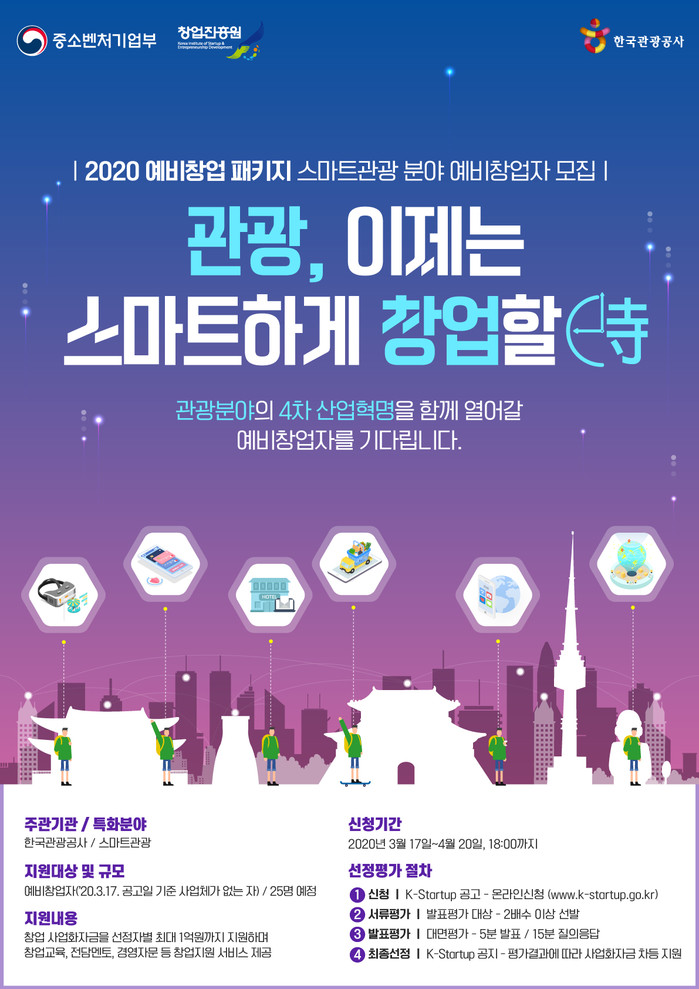 예비창업패키지는 혁신적인 기술창업 아이디어를 보유한 예비창업자의 원활한 초기 사업화를 위해 사업화 자금(최대 1억 원)과 창업자 역량 강화 교육, 창업.경영 전문가 멘토링 및 판로개척 등을 패키지로 지원하는 사업이다. 공사는 작년 하반기 ‘관광분야’로 총 22명의 예비창업자를 선발, 육성 중이며, 올해는 분야를 스마트관광으로 특화해 총 25명의 예비창업자를 선정할 예정이다.
