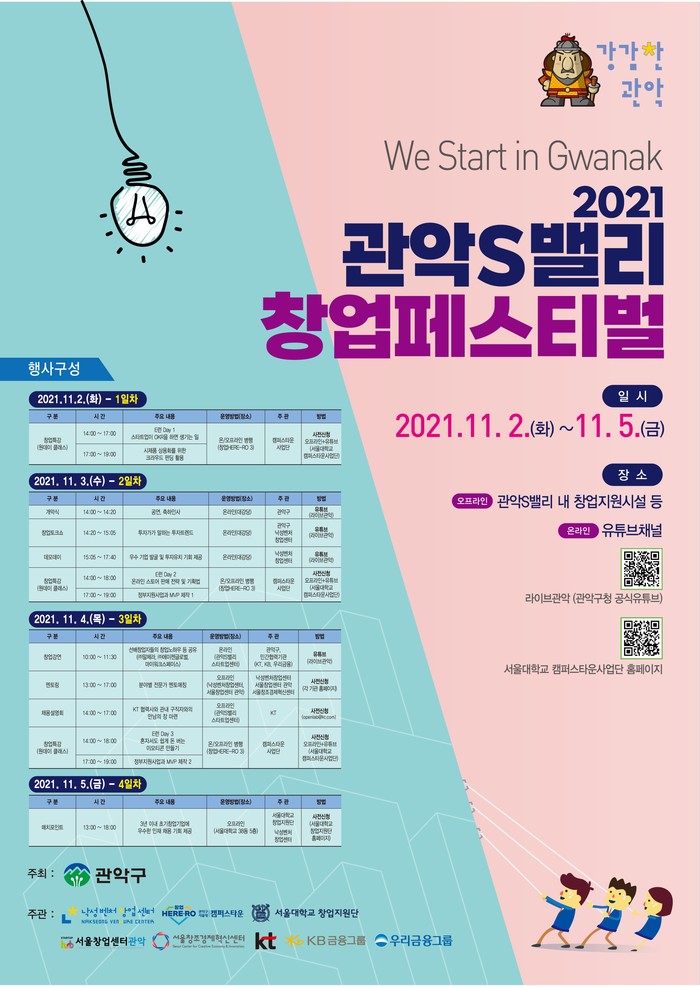 이번 행사는 구와 함께 관악S밸리를 만들어가는 서울시, 서울대학교, KT, KB, 우리금융, 서울창조경제혁신센터 등 민·관·학이 연계하여 데모데이, 창업특강, 멘토링 등 창업자들에게 실질적 도움을 줄 수 있는 다양한 프로그램을 구성해 코로나19 장기화로 어려움을 겪고 있는 창업자를 찾아간다.