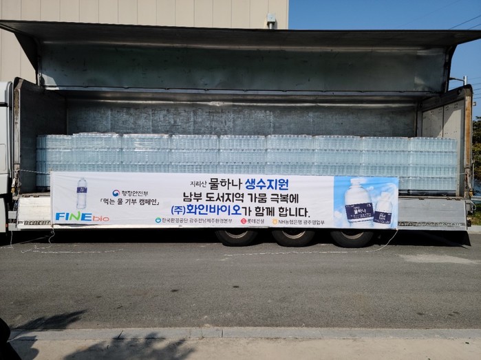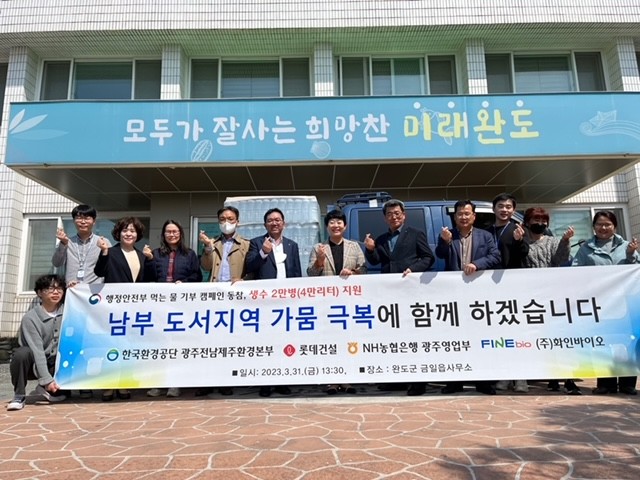 공단 등 4개사는 전라남도 완도군 금일읍사무소를 방문하여 ㈜화인바이오에서 생산한 생수 2만병(4만 리터)을 직접 전달하였다.