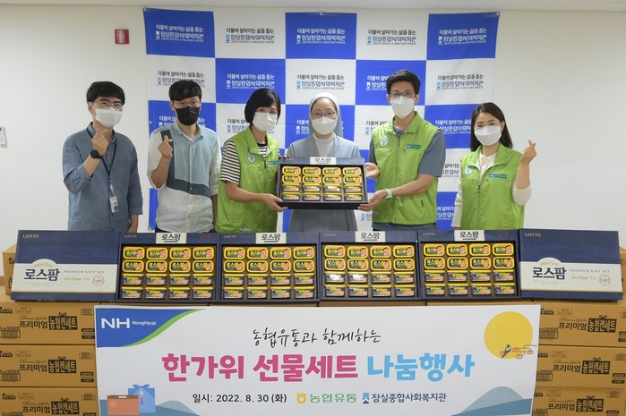 | ▲ 8월 30일(화) 농협유통 임직원들이 임인년 추석을 맞아 잠실종합사회복지관에 방문해 ‘사랑의 명절 선물세트’를 전달했다<사진제공=농협유통>. |