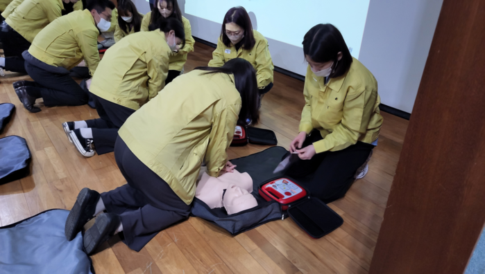 더욱이 최근 발생한 이태원 사고 등으로 안전에 대한 관심이 높아지고 있어 훈련 첫날인 11월 14일(월)에 전 직원을 대상으로 급성심정지 환자발생을 대비한 심폐소생술 및 자동심장충격기 사용법, 하임리히법 등 일상생활에서 필요한 응급처치 방법을 실시했다.