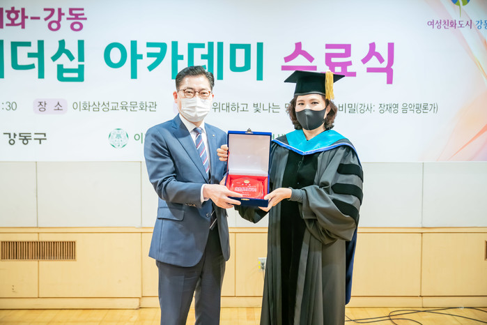 이날 수료증 받으며 수강생 대표는 ‘코로나로 지친 일상에 다양한 강의로 유익한 시간을 마련해 준 강동구청과 이화여대 글로벌미래평생교육원 관계자분들께 감사하다’ 며 소감을 남겼고, 최경실 원장(이화여자대학교 글로벌미래평생교육원)은 ‘이화의 정신인 진선미를 추구하며 미래로 나아가 강동구의 여성리더로 이웃들에게 용기와 희망을 주는 주인공이 되시기를 바란다’ 라며 다시 한 번 축하인사를 전했다.