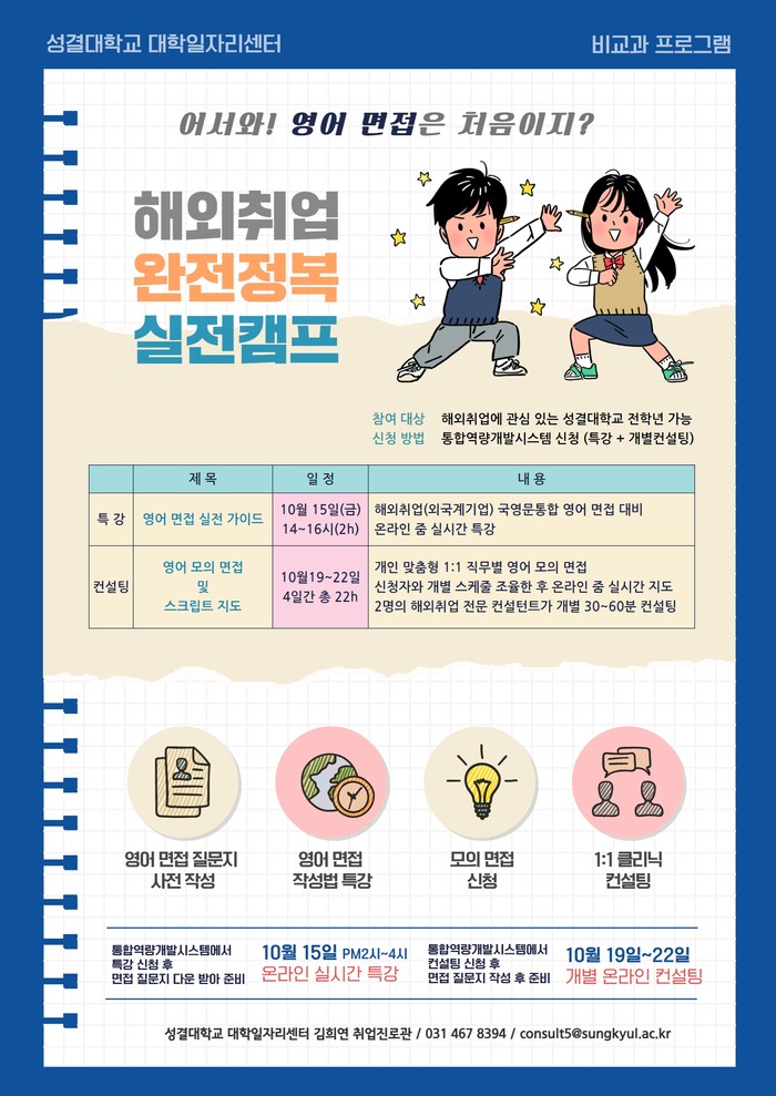 프로그램 세부 구성은 10월15일에 영어면접 실전 가이드(영어면접 대비)특강을 진행할 예정이다. 해외취업(외국계 기업) 면접 질문 리스트를 미리 준비하여 해당 질문에 의해 모의 면접을 수행할 계획이다.