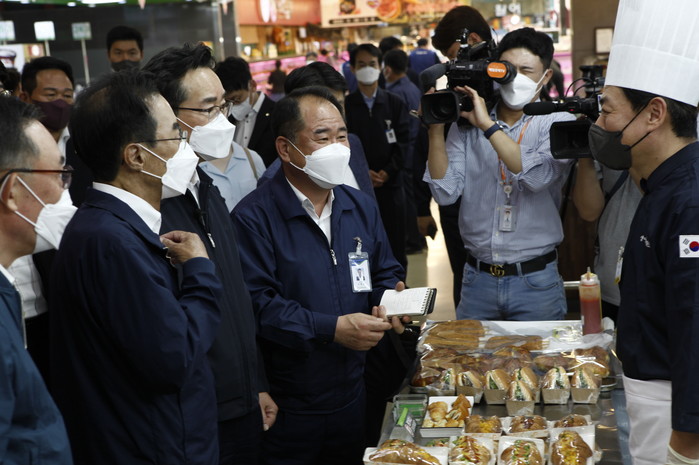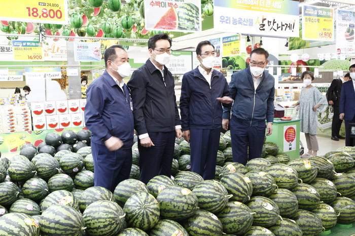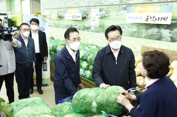 정황근 농림축산식품부 장관과 농림축산식품부 관계자들은 30일 ‘살 맛나는 국민밥상’ 특별 판매 행사가 진행되고 있는 농협하나로마트 양재점을 찾아 이성희 농협중앙회 회장과 함께 물가급등 품목과 농축산물 가격 동향을 점검하고 이번 특별판매 행사를 살펴봤다.