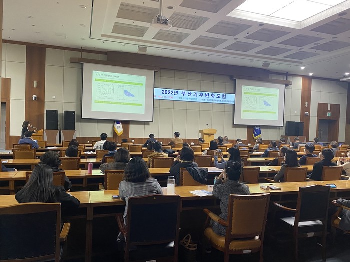 | ▲ 17일, 부산시청 국제회의장에서 진행된 '2022년 부산 기후변화 포럼'의 주제발표 모습<사진제공=APEC기후센터> |