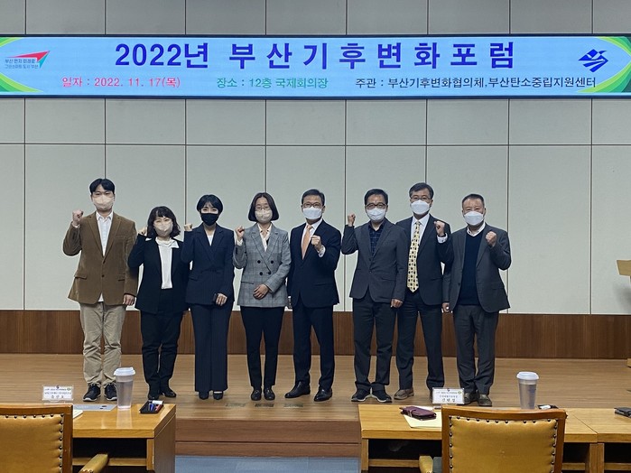 | ▲ 2022년 부산 기후변화 포럼 주요 참가자 기념 촬영, 사진 오른쪽 네 번째가 APEC기후센터 신도식 원장, 다섯 번째가 부산지방기상청 김현경 청장 (2022년 11월 17일, 부산시청 국제회의장)<사진제공=APEC기후센터> |