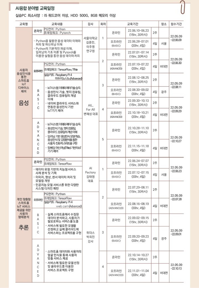 지능정보산업협회는 산학연 전문가와 함께 교육과정을 설계했으며, 가전산업의 AIoT 기술적용을 위한 기술로써 음성, 영상, 추론, BM(Business Model) 4개 분야로 구성된 교육내용을 공동운영을 통해 제공하고, 교육생의 학습수준을 고려한 단계별 교육이 제공될 예정이다.