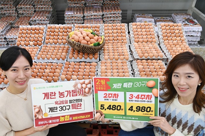 농협 하나로마트 38개 매장에서는 2월 9일부터 26일까지 매주 목·금·토·일요일 4일간 계란 30구 특란 할인행사를 진행하며, 특히 16~19일, 23~26일은 삼성카드로 결제시 500원 추가 할인을 받아 최대 34% 저렴한 4천원대 가격으로 구매할 수 있다.