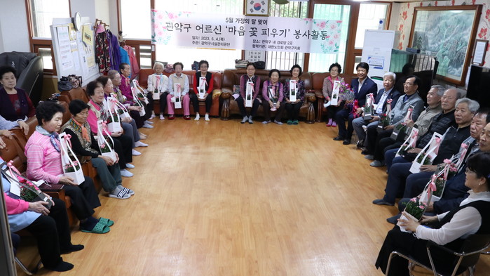 이날 봉사활동에는 공단 임원 포함 직원 14명과 공단 협약기관인 대한노인회 지회장 및 임원 등이 협력하여 관악구 경로당 2곳에 계신 어르신을 찾아뵙고 카네이션 화분과 직원 작성 손편지 60세트를 전달했다.
