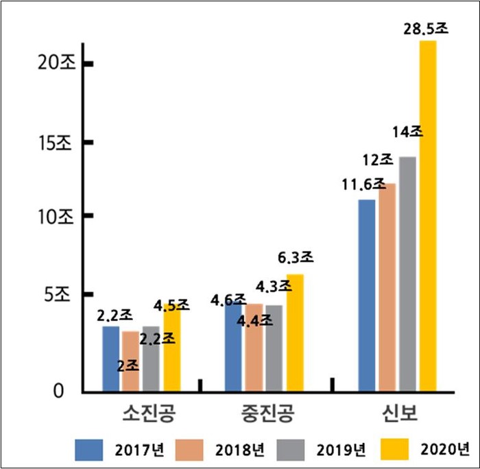 | ▲ <소진공, 중진공, 신보 소상공인·자영업자 및 소기업 대상 정책자금 지급액수> (자료: 각 기관) |