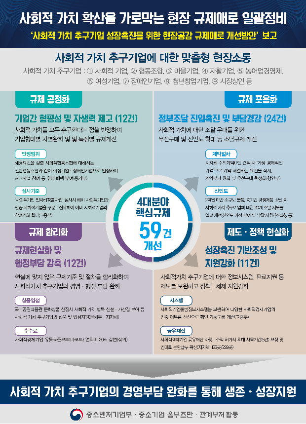| ▲ '사회적 가치 추구기업'이 가지고 있는 4대 분야 핵심 규제 59건을 개정했다. (사진출처=중기부) |