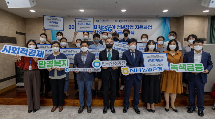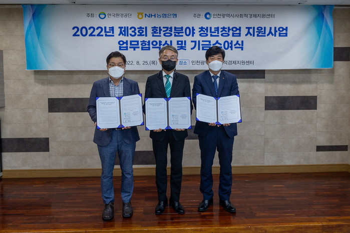 이날 기금 전달식에 앞서 3개 기관을 대표해 한국환경공단 경영기획본부장, NH농협은행 인천영업본부장, 인천광역시 사회적경제지원센터장이 참석하여 환경분야 청년창업 육성을 위한 업무협약을 체결했다.