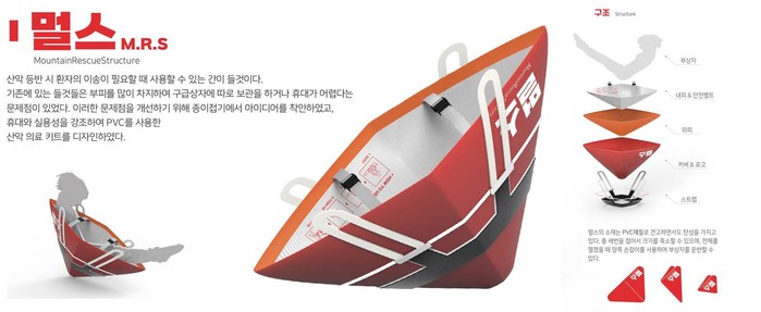 최우수상(한국환경산업기술원장상, 상금 300만원)에는 최유나, 박지영, 이현희 팀의 ‘멀스’ 작품으로, 산악 등반 시 환자의 이송이 필요할 때 사용할 수 있는 간이 들것이며, 휴대와 실용성을 강조한 산악키트 형태의 작품이 선정됐다.