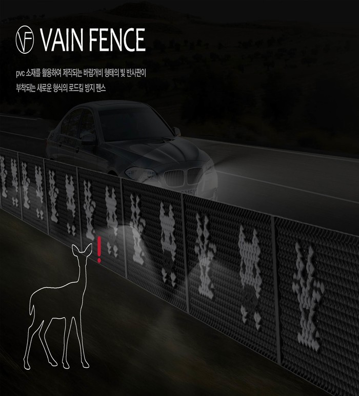 우수상(한국바이닐환경협회장상, 상금 100만원)을 수상한 신지우, 성호성 팀의 VAIN FENCE는 PVC재질의 펜스 프레임에 빛 반사 형태의 바람개비를 부착해 차량 불빛 등을 반사 시켜 운전자와 동물들에게 위험을 인지 시켜주는 로드킬 방지 펜스이다.