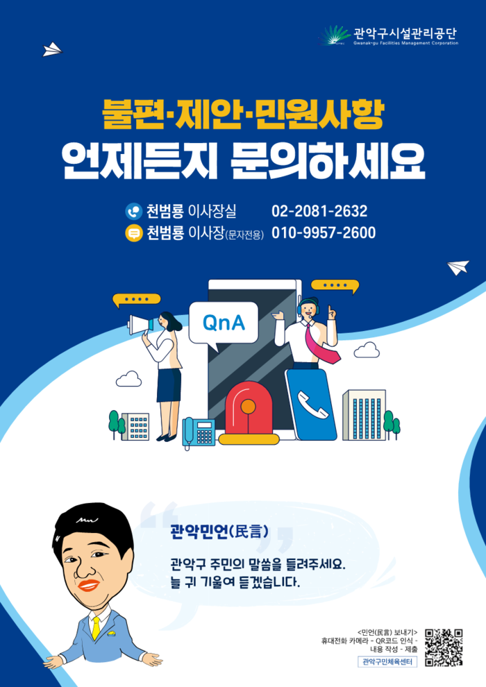 | ▲ 천범룡 이사장-주민 새로운 소통창구 ‘관악민언(民言)’ 포스터<사진제공=관악구시설관리공단> |