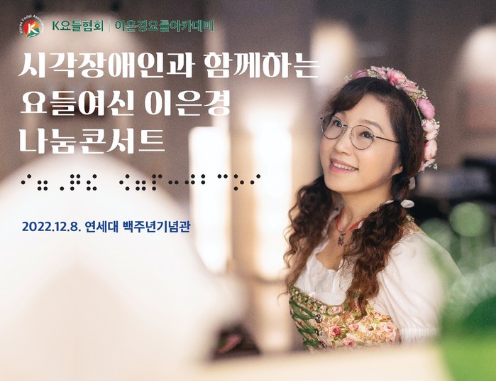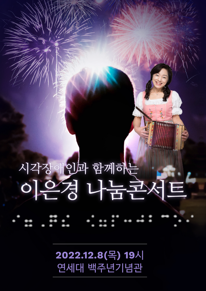 시각장애인과 함께하는 이은경 나눔콘서트가 12월 8일 (목) 저녁 7시에 연세대학교 백주년기념관에서 시각장애인 200여명을 비롯하여, 생명의 빛이 되고자 하는 관객들과 함께 화려하게 펼쳐진다.