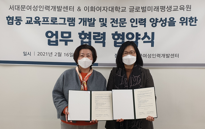 | ▲ (사진 왼쪽부터)조상미 이화여대 글로벌미래평생교육원장과 박정숙 서대문구여성인력개발센터 관장(사진제공=이화여자대학교 글로벌미래평생교육원) |