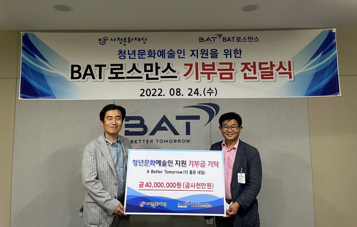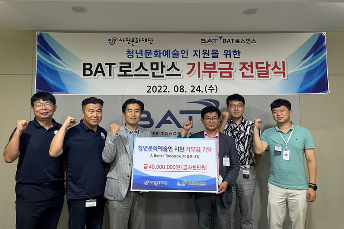 BAT로스만스와 사천문화재단이 함께 진행하는 청년문화예술 지원사업은 청년예술단체의 역량 강화와 지역 인재를 육성하기 위해 마련됐다. 이번 기부금은 코로나19로 어려움을 겪은 청년예술단체를 지원하고, 그들의 안정적인 창작활동 환경을 조성해 청년문화예술인의 자생력 확대를 돕는데 사용될 예정이다.
