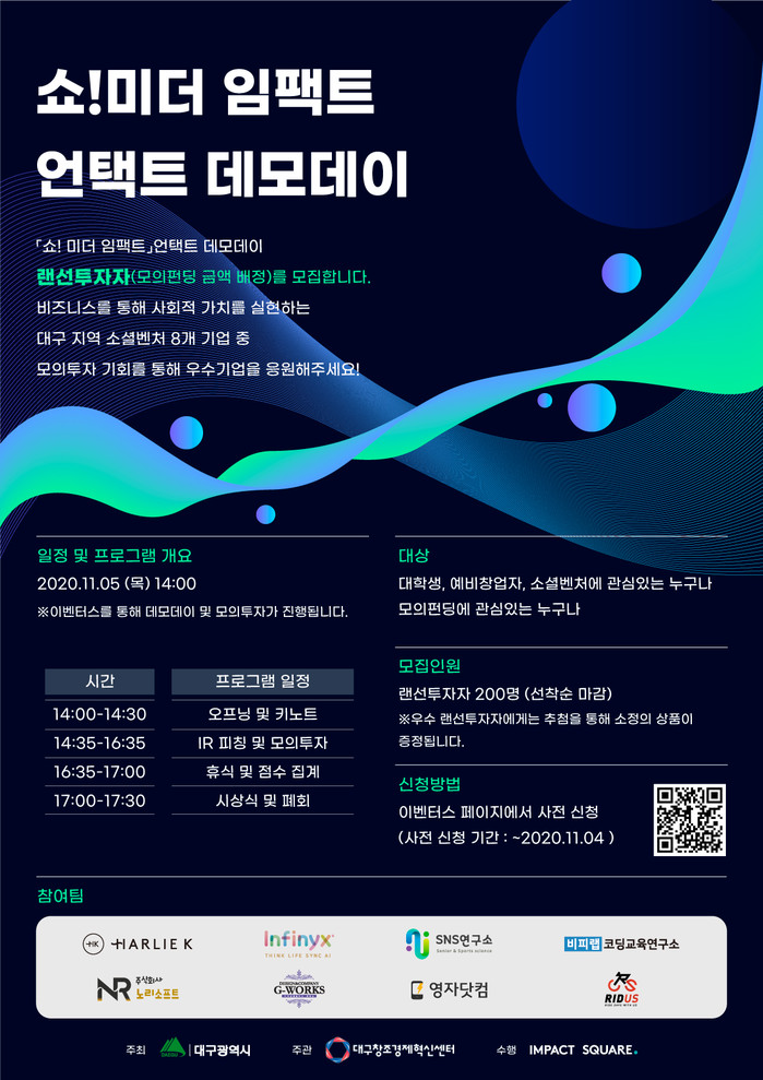 대구·경북지역 소셜벤처 8개 기업이 참여하는 금번 행사는 참가기업이 발표·질의 응답하는 모습을 온라인 실시간 송출하여, 관객들이 비대면으로 온라인 모의 투자를 할 수 있도록 구성했고 심사위원 또한 서울 한 행사장에 자리를 마련해서 실시간 화상회의 플랫폼 등으로 진행할 계획이다.
