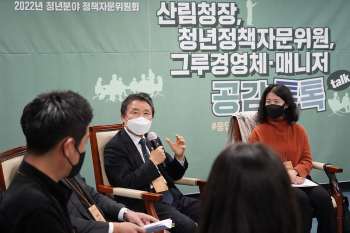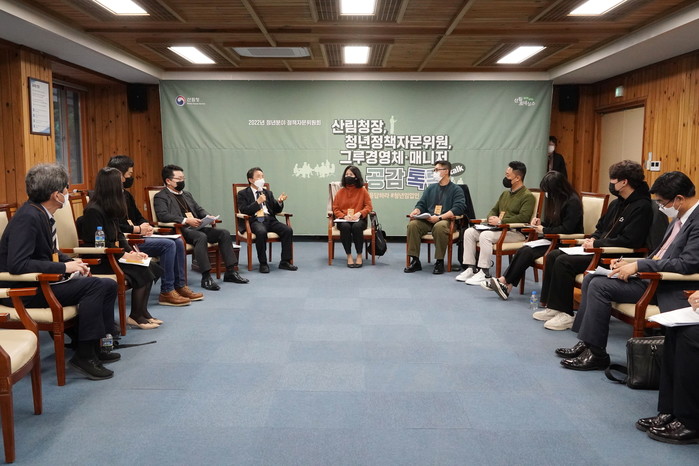 이번 간담회에는 산마을 영농조합법인 박민철 대표이사, ㈜포레스트네트워크 박예일 대표, 농업회사법인 ㈜한반도 배강찬 대표, 에코그룹 유성민 대표, 디엠지(DMZ)숲 임미려 대표 등 5명의 청년 정책자문위원을 비롯해 청년 그루매니저(경영체) 3명 등이 참석해 산림 분야 청년정책의 발전 방향에 대하여 소통했다.