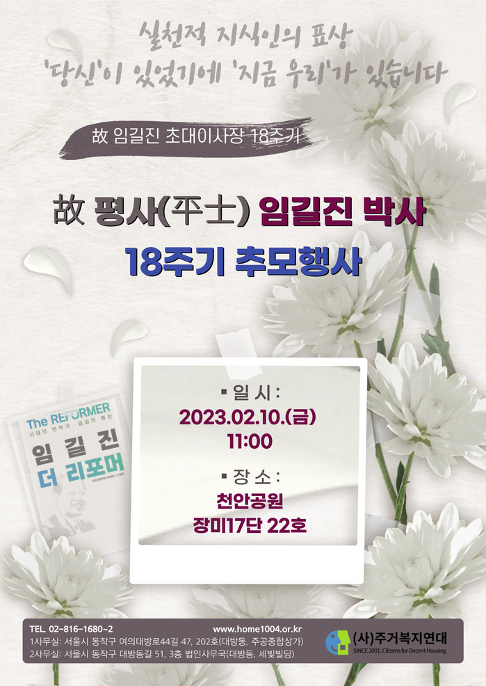 천안공원(무학지구) 장미17단 22호에서 진행된 이번 추모식은 (사)주거복지연대 남상오 이사장, 평택시민사회재단 조종건 상임대표와 윤시관 공동대표, 너분열마을회 안상욱 회장(수원시 지속가능도시재단 前 이사장) 등 10여 명이 참석해 故 임길진 박사((사)주거복지연대 초대이사장)의 뜻을 기리는 추모의 시간을 보냈다.