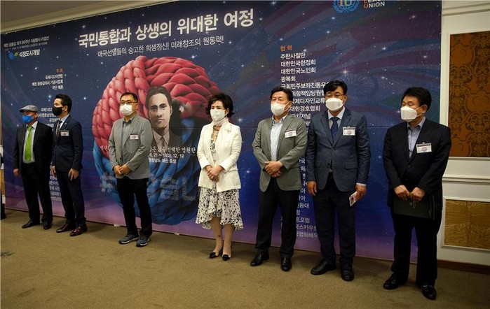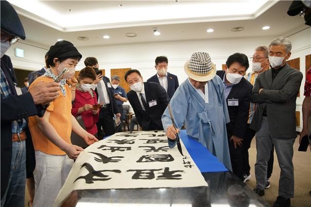 2부 무궁화홀에서 진행된 리셉션행사는 태극서법의 창시자이자 대한민국 국회의원 서도회의 지도위원이신 초당 이무호 선생의 붓글씨 휘호(丈夫出家生不還 祖國光復死生魂)로 시작됐다.