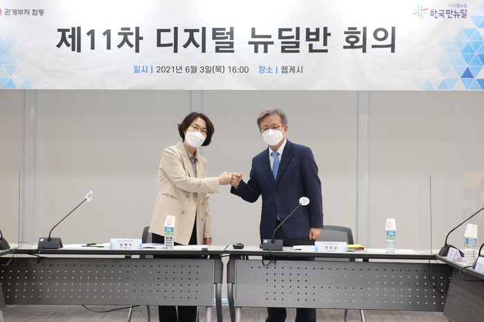 | ▲(왼쪽부터) 임혜숙 과기정통부 장관과 권칠승 중기부 장관이 지난 3일 '제11회 디지털 뉴딜반 회의'를 개최했다. (사진제공=중소벤처기업부) |