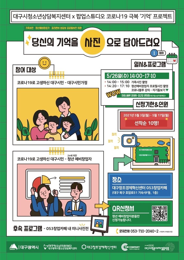 예비 청년창업자와 프리랜서 청소년지도자를 대상으로 진행되는 스튜디오는 대구광역시청소년상담복지센터의 코로나 블루에 관한 특강과 더불어 프로필 사진 촬영도 진행될 예정이다.