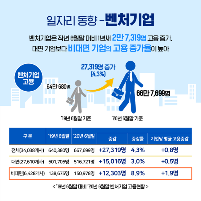 | ▲ '19년 6월 말 대비한, '20년 6월말 벤처기업 고용현황은 비대면 기업의 증가율이 높아진 상태이다. (사진출처=중기부) |