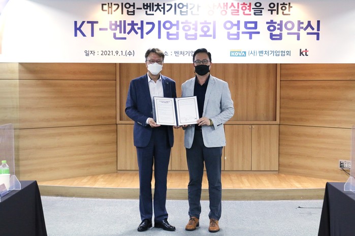 | ▲ 벤처기업협회 이정민 사무국장(우측)과 KT 신금석 SCM전략실장(좌측)이 협약서를 들고 있다<사진제공=한국벤처협회> |