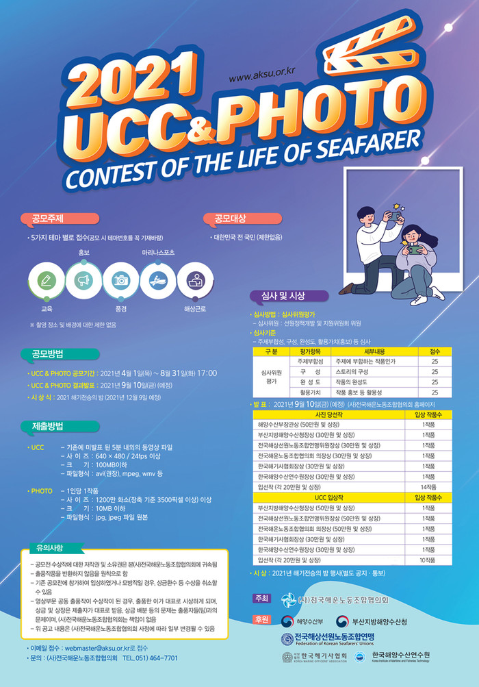 『2021 UCC & Photo Contest of 'The Life of Seafarer‘』 공모전은 (사)전국해운노동조합협의회가 주최하고 해양수산부, 부산지방해양수산청, 전국해상선원노동조합연맹, 한국해기사협회, 한국해양수산연수원이 후원하는 이번 공모전은 해상에서 활동하는 근로자의 사기를 증진시키고 국민의 해상생활 및 근로에 대한 의식 전환과 직업군으로써 청년들의 관심을 유도하고자 기획됐다.