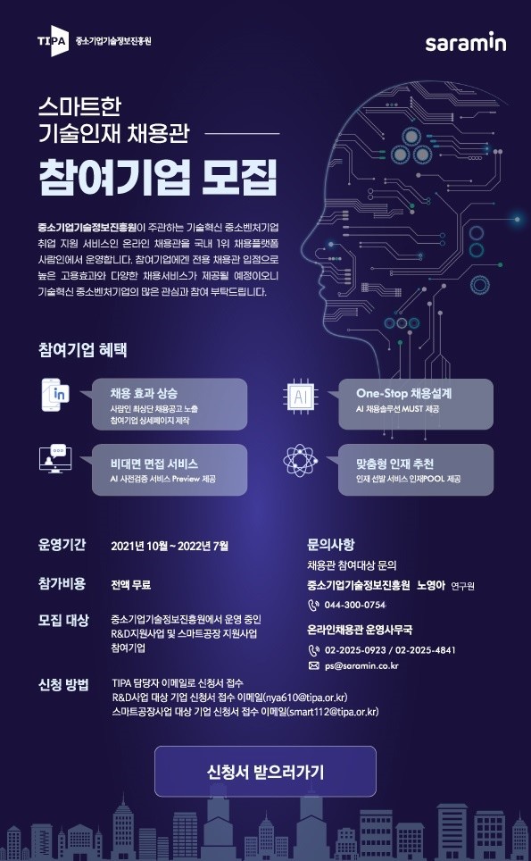 기술인재 채용관 입점을 희망하는 중소기업들은 중소기업기술개발사업 종합관리시스템 홈페이지를 통해 상세한 내용을 확인할 수 있다.
