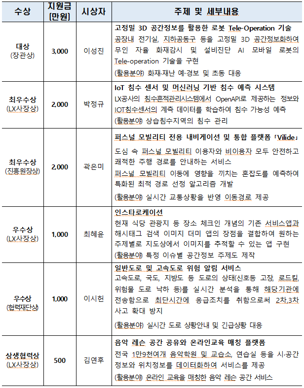 *부문별 국토교통부 장관상(1), LX공사 사장상(3), 공간정보산업진흥원 원장상(1), 대중소기업농어업협력재단상(1)