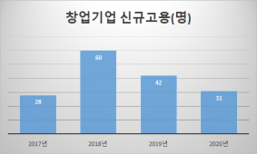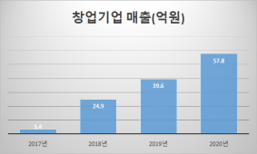 또한 ‘17년부터 공모전에서 수상한 참가자들에게 지원한 공유 오피스에 입주한 16개 창업기업의 매출을 보면 ’17년 첫해에는 3.4억 원이었지만 △‘18년 24.9억 원, △’19년 39.6억 원, △‘20년 11월까지 57.8억 원 등 총 125.7억 원의 매출을 달성하였으며, 신규고용을 살펴보면 ▲’17년에는 28명, ▲‘18년 60명, ▲’19년 42명, ▲‘20년 11월까지 31명 등 총 161명의 신규 일자리 창출 효과가 있었다.