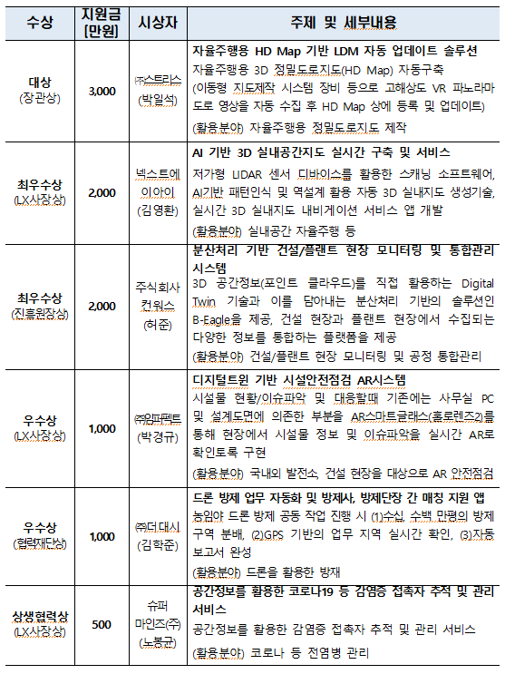 이 외에도, 김영환 ㈜넥스트에이아이 대표의 ‘AI 기반 3D 실내공간 지도 실시간 구축 및 서비스’ 등 △최우수상 4팀, 박경규 ㈜임퍼펙트 대표의 ‘디지털 트윈 기반 시설 안전 점검 AR 시스템’ 등 △우수상 4팀, 노봉균 ㈜슈퍼마인즈 대표의 ‘공간정보를 활용한 코로나-19 등 감염증 접촉자 추적 및 관리 서비스’ 등 상색협력상 2팀이 선정됐다.