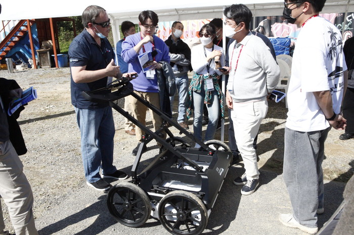 | ▲ 카트형 멀티채널 ’GPR Stream DP‘에 설명을 하고 있는 Hexagon Detection IDS GeoRadar 직원<사진제공=씨앤에치아이앤씨(주)> |