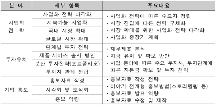 또한, 참여기업은 첫째 날(오는 15일) ‘사업화 전략, 투자유치, 기업 홍보’와 관련한 전문 투자사와 기업 간 1:1 맞춤형 전담교육을 진행하고 그 다음날은 ‘사업화 홍보 전략 수립’으로 전문 투자사에게 투자 유치를 요청하는 ‘모의 투자 설명회’가 되는데 발표내용을 듣고 개선이 필요한 사항을 조언하는 행사까지 함께 진행할 수 있다.