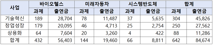 선정된 642개 과제를 분야별로 살펴보면 ▲바이오헬스 432개(67.3%), ▲미래자동차 144개(22.4%), ▲시스템반도체 66개(10.3%) 과제 순으로 선정됐다.