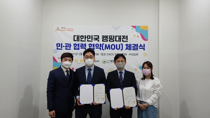 | ▲대한캠핑장협회와 (주)디오씨가 업무협약을 마치고 기념 촬영을 하고 있다. (사진제공=대한캠핑장협회) |