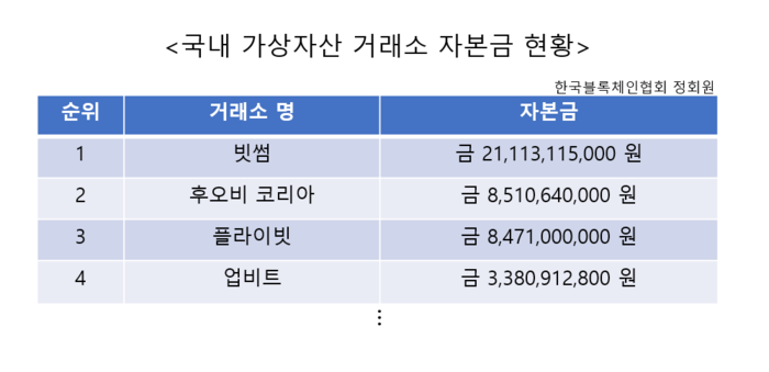 국내 가상자산 거래소(한국블록체인협회 정회원) 자본금 보유 현황 자료에 따르면, 2021년 4월 기준으로 1위 빗썸 (약 211억 원 규모), 2위 후오비 코리아 (약 85.1억 원 규모), 3위 플라이빗 (약 84.71억 원 규모), 4위 업비트 (약 33.8억 원 규모) 등 순으로 조사됐다.