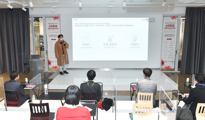 ▲ '광고 영상 자동제작 플랫폼' 을 보유하고 있는 (주)더브이플래닛의 대표가 콘텐츠를 소개하고 있다. (사진출처=KITA) |