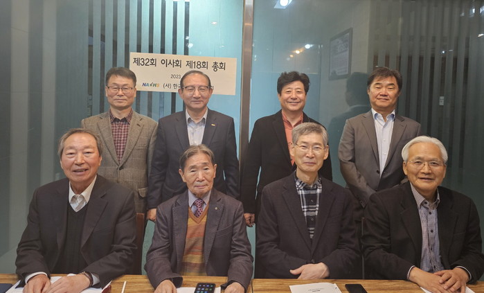 | ▲ (왼쪽 아래에서 2번째)총회에서 제6대회장으로 선출돼 연임한 박성득 회장<사진제공=(사)한국해킹보안협회> |