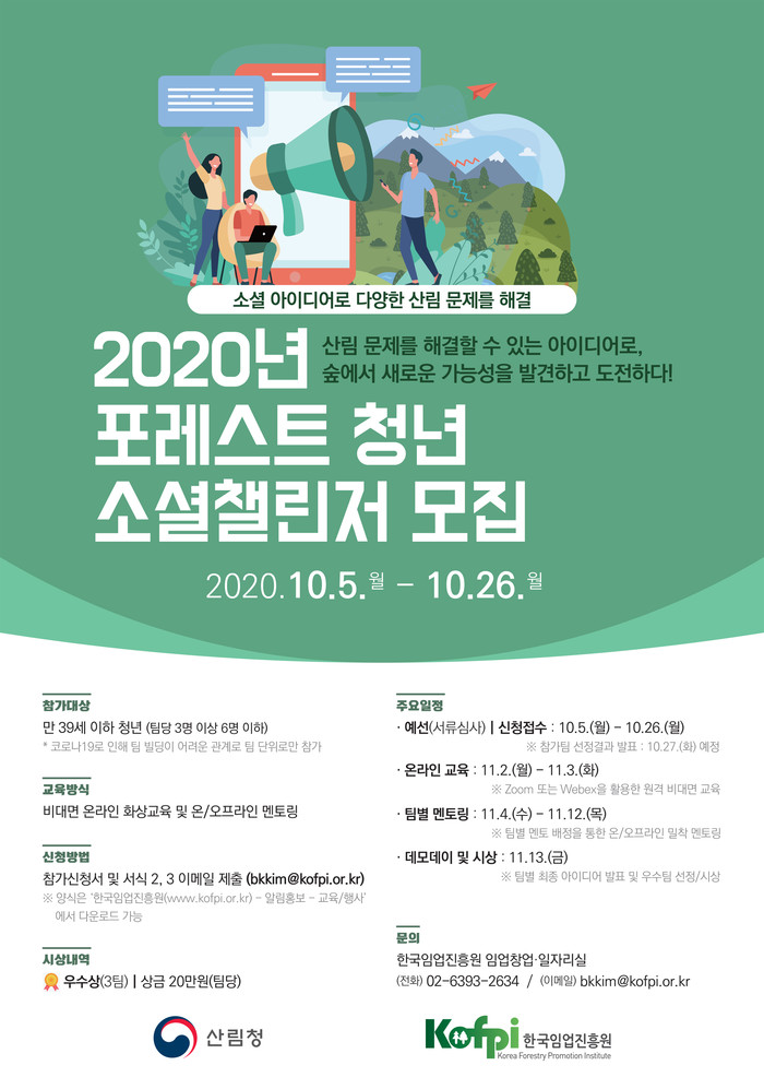 [더스타트 = 윤상학 기자] 산림청과 한국임업진흥원은 이번 달 26일까지, ‘2020년 포레스트 청년 소셜 챌린저’에 참가하고 싶은 청년들을 온라인으로 모집한다고 발표했다.