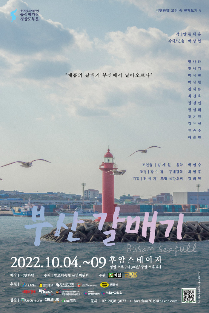 제4회 말모이연극제' 경상부문 참가작으로 공연되는 극단 '화담'의 연극 '부산갈매기'는 서울 대학로 후암 스테이지에서 10월4일(수)~9일(일)까지 공연한다.