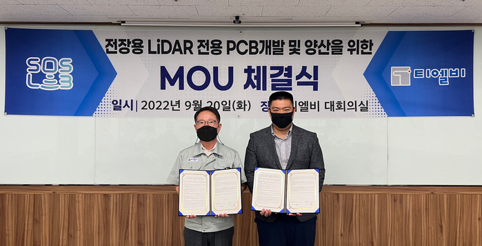 협약식은 지난 20일 경기도 안산시 소재 티엘비 본사에서 진행됐다. 티엘비와 에스오에스랩은 자율주행 차량용 LiDAR전용 고신뢰성 PCB 개발을 위한 포괄적 협력 체계 구축을 위해 제휴 협약(MOU)를 체결하고 실무 공동 협의체를 구성한다고 밝혔다.