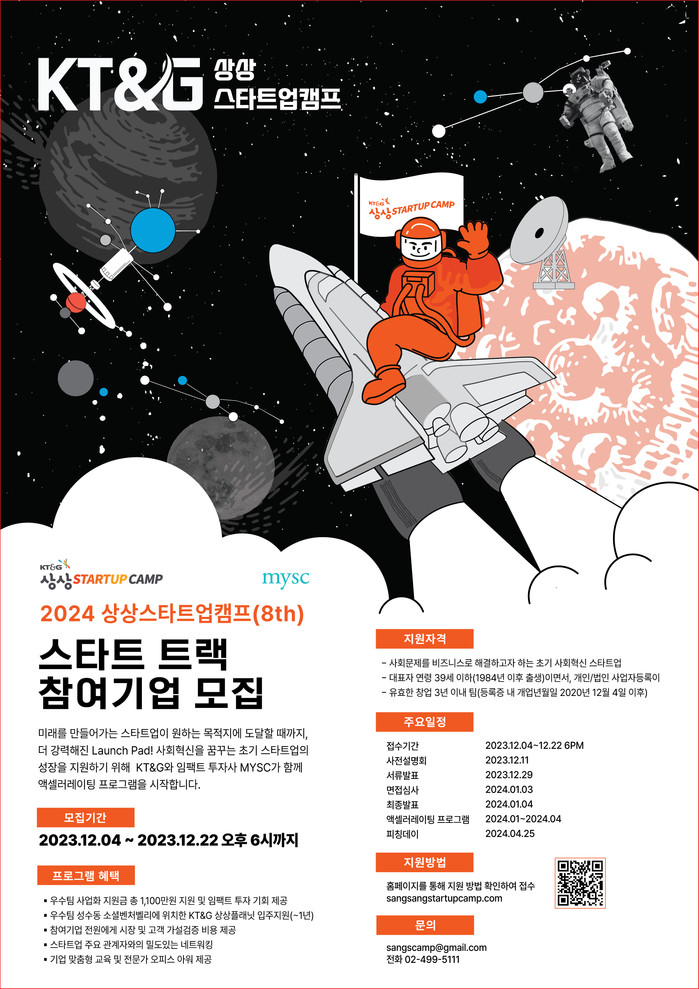 KT&G는 교육 비용 전액을 지원하며 우수팀들에게는 상금을 비롯해 서울 성수동에 위치한 청년창업 전용 공간인 ‘KT&G 상상플래닛’ 입주 지원과 투자 유치 연계 등 경쟁력 강화를 위한 다양한 후속 지원도 함께 추진할 예정이다.
