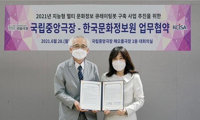 지난 6월 28일(월) 국립극장 해오름극장에서 진행된 업무협약식에는 국립극장 김철호 극장장과 한국문화정보원 홍희경 원장 등 두 기관 주요 관계자가 참석해 큐아이 서비스의 성공적인 구축을 위한 협력을 추진키로 했다.