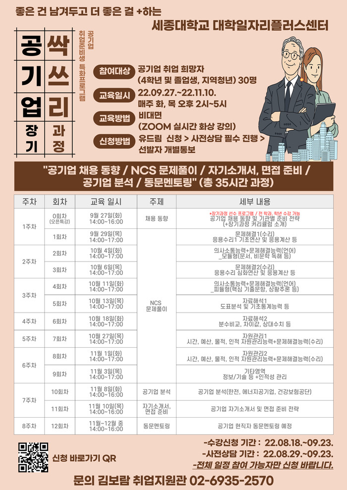 이번 프로그램은 세종대 대학일자리플러스센터 거점형 특화프로그램의 일환으로 진행되며, 공기업 취업을 준비하고 있는 학생들을 위해 마련됐다. 세종대 졸업(예정)자뿐만 아니라 취업에 관심 있는 지역 청년이 대상이며, ZOOM을 활용한 비대면 방식으로 운영된다.