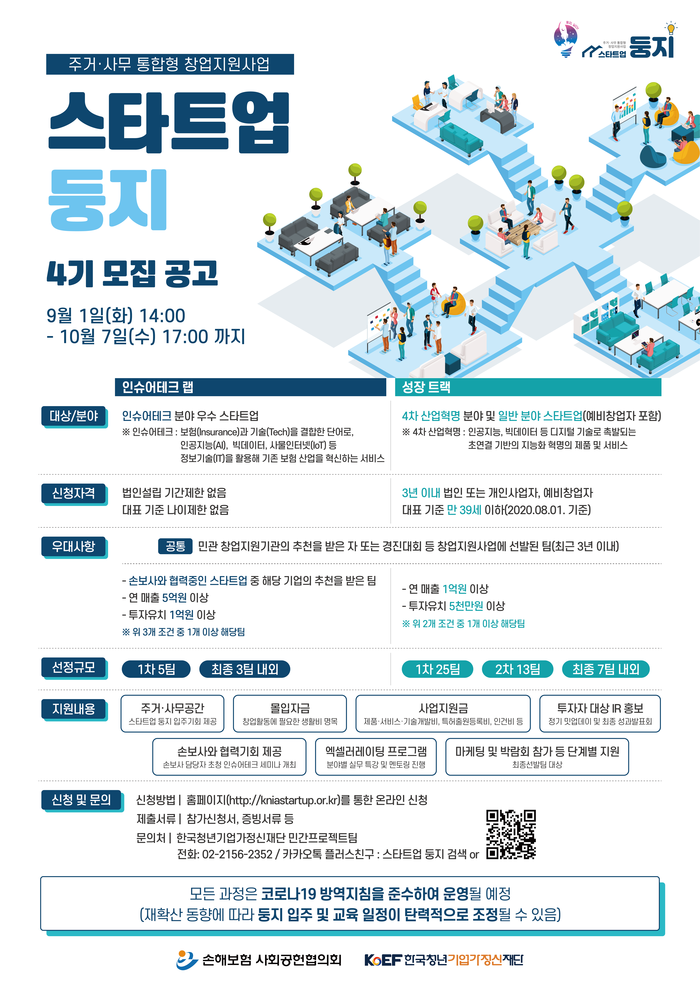 모집대상은 '인슈어테크 랩(Insurtech Lab)분야 우수 스타트업'과 ‘성장 트랙 분야 일반 스타트업’이며 3년 이내 법인 및 개인사업자 및 예비창업자이거나 4차 산업 혁명 분야의 아이템을 가진 기업 또는 개인이 신청할 수 있다.