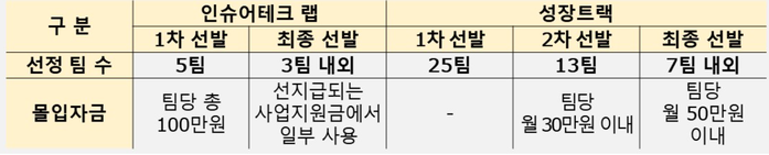 | ▲ 1차 및 최종선발의 선정팀과 몰입자금을 한 눈에 알아보기 쉽게 표현했다. (사진출처=한국청년기업가정신재단) |